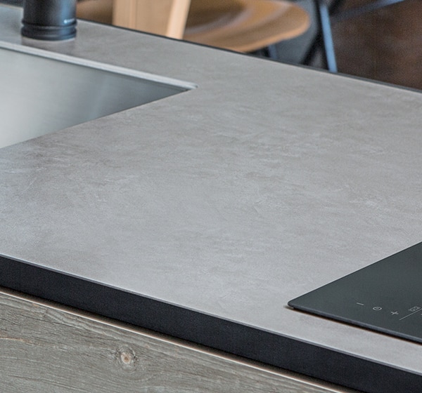 天板はメイド・イン・イタリーのセラミックタイル。毎日使う作業スペースだから、強靭かつグレード感あふれる素材にこだわりました。ビンテージテイストの面材と組み合わせることで、カジュアルになりすぎず、また重厚感もほどよく抑えられ、バランスのよいキッチン空間を演出します。