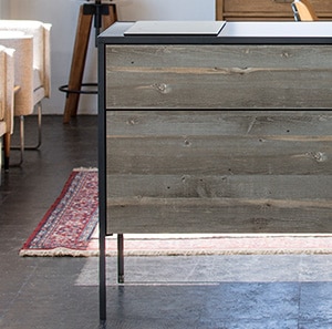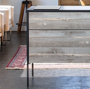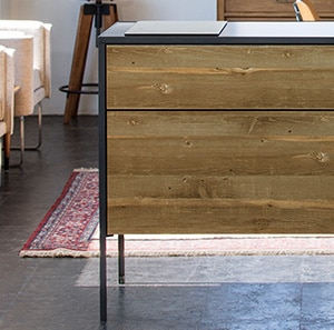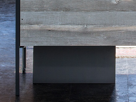 面材は、使い込んだ木の質感を忠実に表現。経年美化してかすれたような木目や、節の表情までリアルに表しています。黒のスチールフレームは、そんな面材の表情を引き締めながらビンテージテイストを強調。主張が強い素材の組み合わせは重い印象になりがちですが、足元を浮かせるデザインで軽さを演出し、どんな空間にも馴染みやすいのが魅力です。