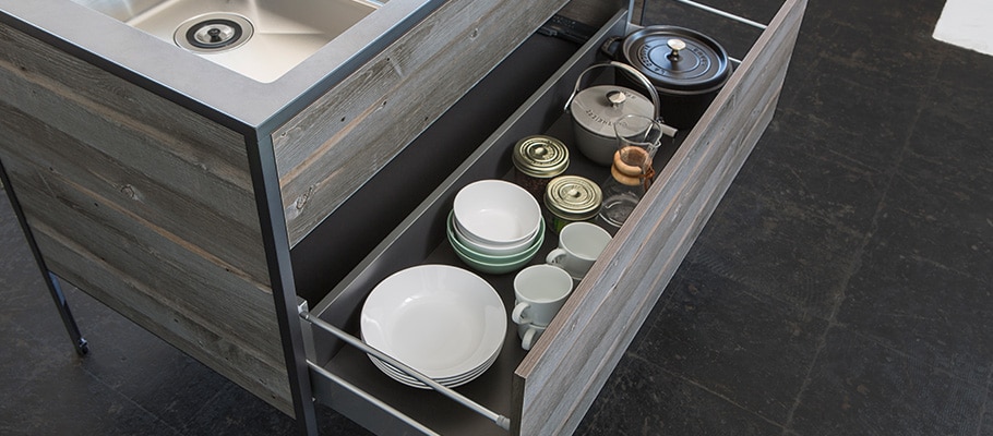 荒々しい木目を表現した面材と、落ち着いた風合いの黒いスチールフレームの組み合わせは、足元を浮かせるデザインで軽さを演出しており、シングルやカップルの暮らしに最適なコンパクトキッチンです。より家具に近いたたずまいを見せ、インダストリアルな空間を好まれる方や若い世代の方へ、インテリアのアクセントとして空間に調和します。
