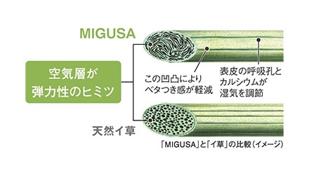 高度な樹脂加工技術により天然イ草の構造を再現するとともに、素材の配合バランスにより天然イ草の風合いと吸湿性を再現しています。素材:樹脂(ポリプロピレン)、無機材料(カルシウム)