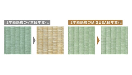 天然イ草に比べて経年劣化が起こりにくく、毛羽立ちにくいので頻繁な畳張り替えの必要はありません。