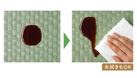 天然イ草に比べて、100%に近い洗浄率(汚れの取れやすさ)なので、手入れやお掃除が簡単です。