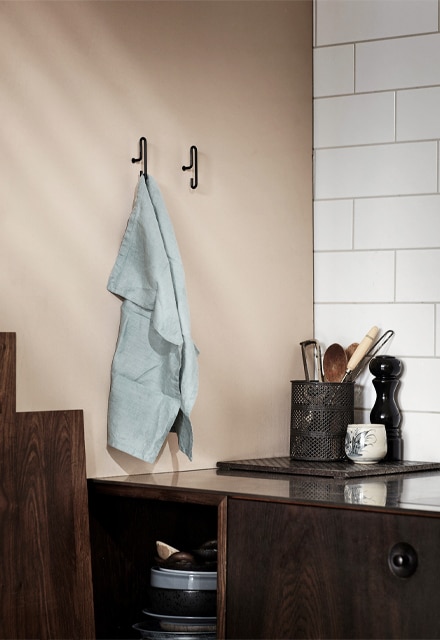 上部のゆるやかな曲線状のフックにはコートやジャケット、シャツなどのデリケートな衣類をかけておくのに最適です。下部のフックは小さめの返しが付いているので、ティータオルのループを引っ掛けたり、ハンガーを引っ掛けたり、ネックレスや鍵など細々としたものを吊るしておくのにも使えます。