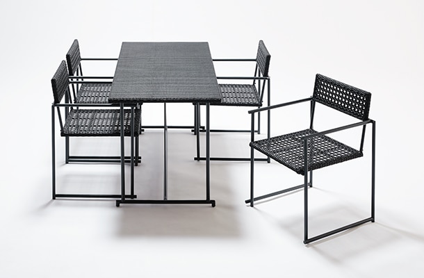 家具のスケール感が視覚的に強調される低重心の設計で、何も置かない時よりも置いた時の方が、不思議と空間に“間”を感じられる効果が生まれます。艶のある人工ラタンをオリジナルで編み込むなど、アウトドア家具にあるまじき贅沢なあしらいもまた、家具を置く喜びを深いものにします。