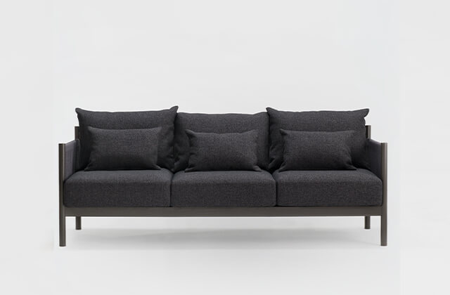 筏(いかだ)のようにシンプルに無垢材を組んだフレームにクッションを載せたソファです。深い奥行きと低く抑えた背もたれによって、小さなスペースでもフィットするボリューム感となっています。使い方もバラエティーに富み、仮眠をとるベッドとしても、広い座面の上であぐらをかくこともできます。