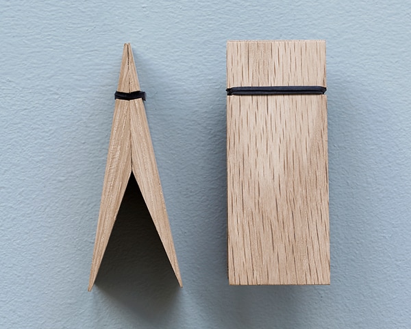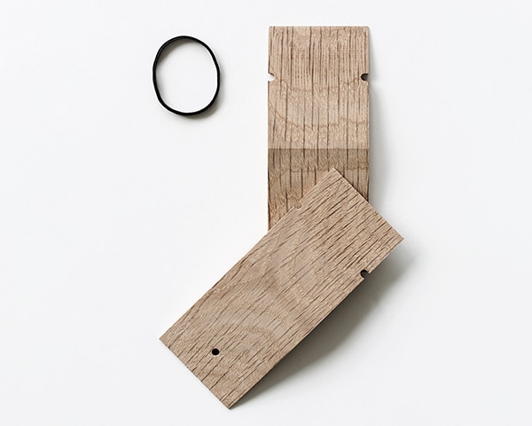 2つの木片パーツを合わせて溝にラバーバンドを引っ掛ける、とてもシンプルなプロダクト。天然木ならではの温かみのある素材は経年変化も楽しめ、長く使うほどに味が出ます。