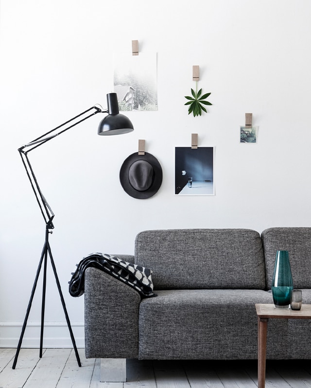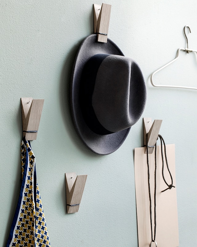 木片パーツの片方には小さな穴が空いており、お手持ちのピンを刺して壁に取り付けられます。メモや写真、ポストカードを挟んだり、軽いものでああればスカーフや帽子を掛けても。