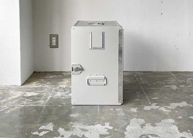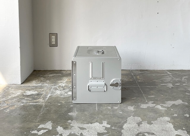 航空で機内食の収納や運搬に使用されていたアルミ製コンテナ。丈夫で軽量なため、持ち運びにも適しており、DIY、キャンプ、釣りなど趣味のためのツールボックスとしてもおすすめ。細部のディテールが航空機用ならではの工夫がされており、普遍的で優れたデザインです。
