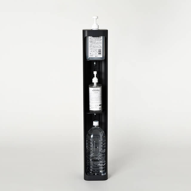 内部には2枚の可動式棚が設置されており、調整によってあらゆる大きさの市販消毒液に対応しています。昨今の新型コロナウイルス対策として、大容量をストックでき、エントランスや公共施設などの空間の美観を損なわないシンプルで機能的なデザインです。