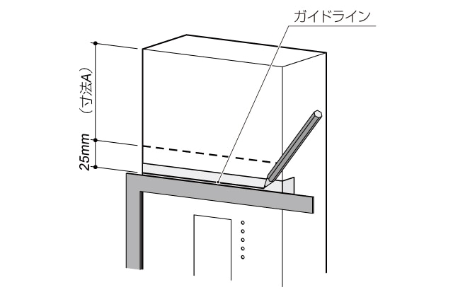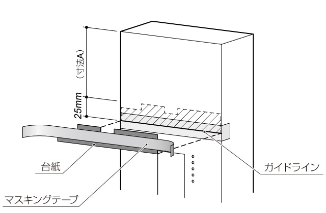 本体への取付位置を決め、取付位置から約25mm下にマスキングテープを貼り、マスキングテープの上から水平にガイドラインを引きます。