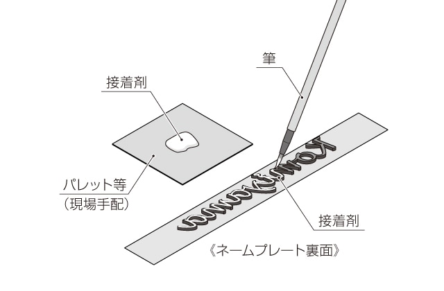 ネームプレートの表面にマスキングテープを貼り、裏面に接着剤を筆で塗布します。接着剤塗布後すぐ、台紙の上端の位置にテープと一緒に取り付けます。十分に接着剤が硬化した後、テープと台紙を取り外します。