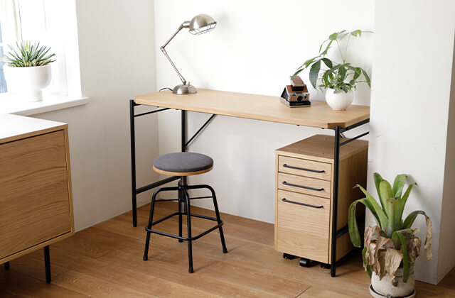 〈チェア〉と〈スツールLow〉は、オーク突板とスチール素材で構成されたライトヴィンテージシリーズです。ダイニングシーンからワークシーンまで幅広くご使用いただけます。 スツールは、座面を回転する事で高さの調整が可能です。