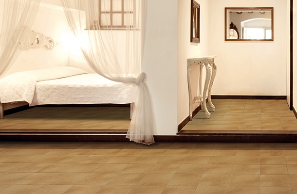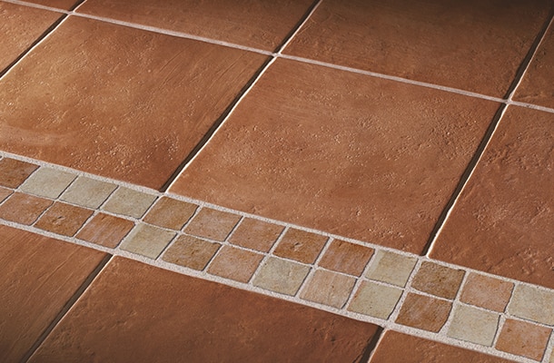 スペイン、イタリア、フランスなどでポピュラーなテラコッタタイルは土を素焼きにしたもので、本来は吸水率の高い陶器質に分類されます。 イタリア生まれの《カンピアーネ》は、このテラコッタらしい素朴な風合いを表現しつつ、吸水率の低い磁器質とすることで住空間に取り入れやすくしたタイルです。フランスのテラコッタが明るいピンクベージュ色であるのに対し、《カンピアーネ》はイタリアの正統と言える赤みが強い色調。温もりあふれる、やさしい雰囲気を空間にもたらします。