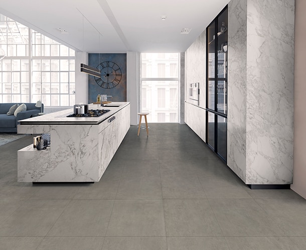 《マッシブ》は吸水率が低いため、キッチンや洗面室などの水まわりにもおすすめ。また屋内だけでなく屋外でも使用でき、玄関土間からポーチへ、リビングからテラスへといった内外の一体感を演出するのに最適です。室内の家具や外の風景を引き立てる、ミニマルなカラー展開も魅力です。
