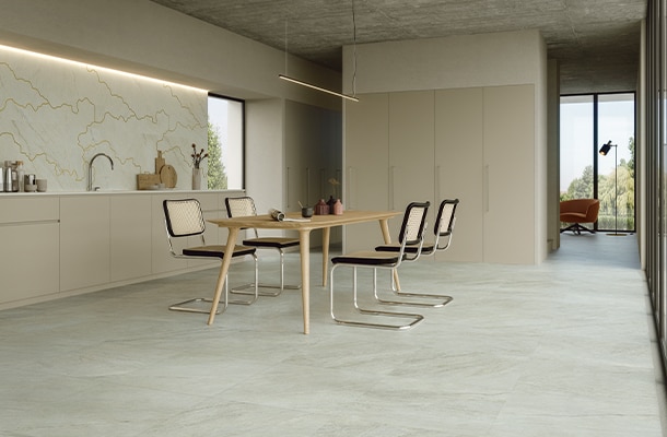 流れるような石目の中に、大自然による浸食や亀裂まで表現したデザイン。悠久の時を刻んだかのような深みとさりげない個性を空間に与え、窓からの景色とも調和します。また屋外の床や壁にも使用でき、周辺の土や植栽にも違和感なく溶け込みます。