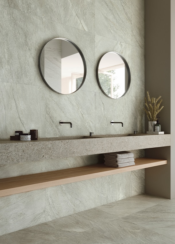 古来の石が持つエッセンスを忠実に再現した《バイブス》。ひと目で分かるはっきりとした石目でありながら、主張しすぎないため空間の中でバランスを取りやすいデザインです。ミラタップ(旧サンワカンパニー)で人気の《クアドロスリム》のように、ミニマルでスタイリッシュな建具とも好相性。カラーは、ニュートラルで使いやすいグレー系を揃えました。