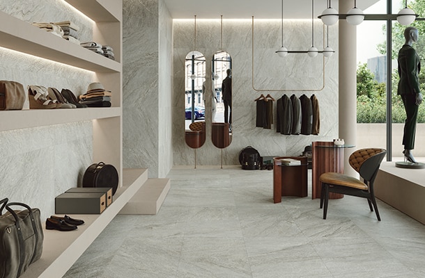 ニュートラルな石目調で 床、壁、屋外に使用可能