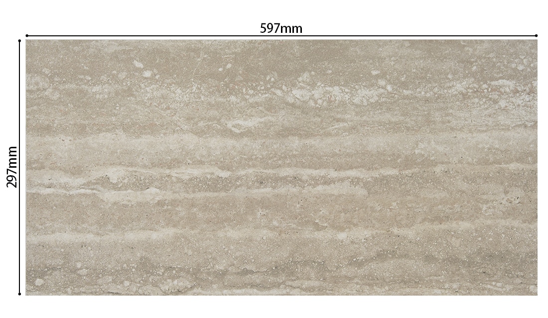 《ニュークラシック》では、大胆に流れるトラバーチンの脈模様が見えるよう、石目に沿って刃を入れた「ベインカット」の本石をモチーフにデザイン。さらに、柄が最も美しく見える300×600mmサイズで仕上げています。