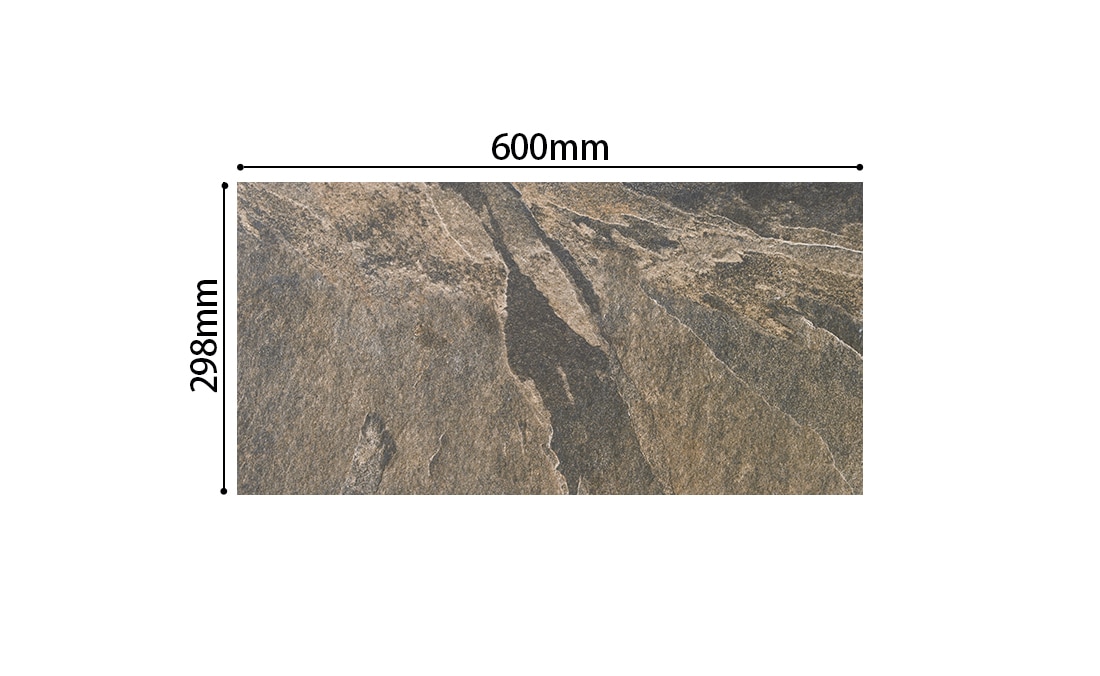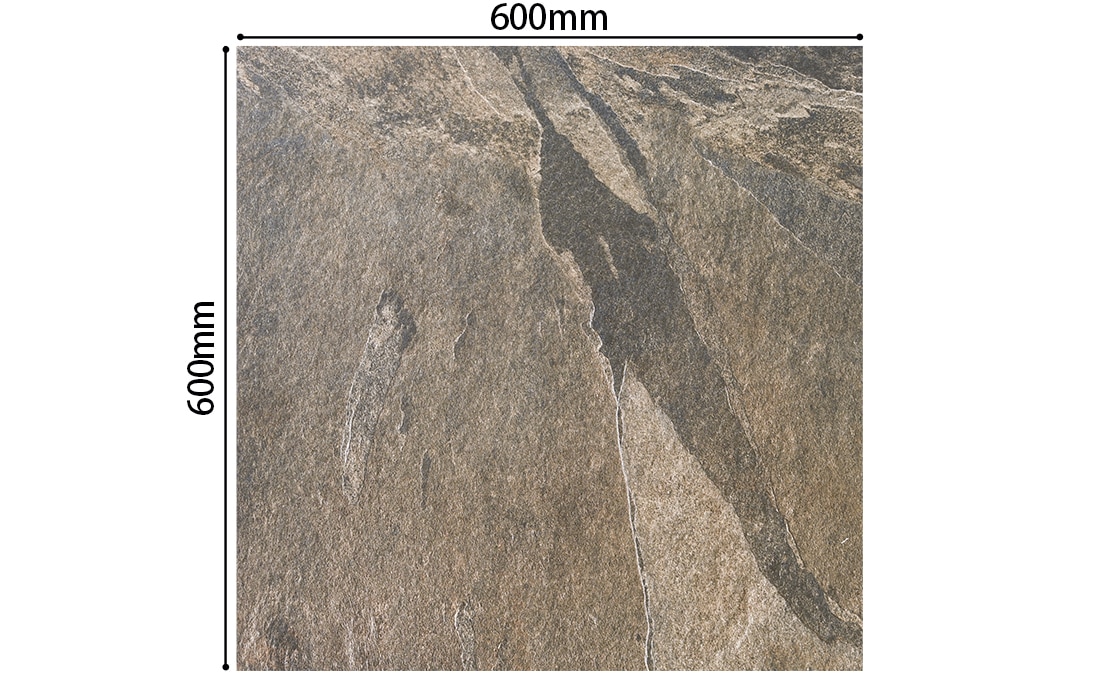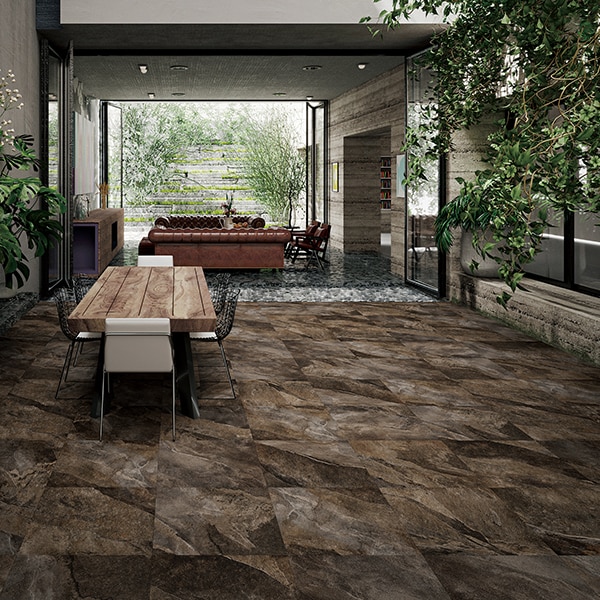 採掘現場に現れる精密かつ雄大な石の層よりインスピレーションを受けた《メデシア》は、ブラジル産のスレート(粘板岩)を思わせるストーン調タイルです。1枚ごとに模様の出方が異なるため、広い面にお使いいただけると華やかな印象に。特に石目模様がより際立つ300mm×600mmの長方形サイズは、貼り方を変えることで様々なフロアデザインを楽しめ、芸術的な空間を生み出します。