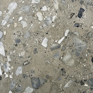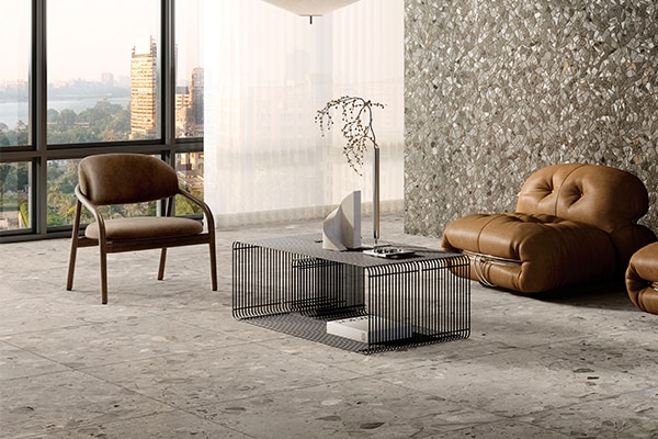 砕石をセメントに混ぜ込むテラゾー仕上げが今、世界的に人気再燃。このテラゾー風を大胆に表現し、2024年にタイルの国際展示会チェルサイエで最も注目を集めたのが《サッシトーリ》です。骨材となる砕石部分の大きな存在感を、よりダイナミックに楽しめる900角でご用意しました。色幅をやや絞った色彩構成も絶妙に今風。現代の感覚で伝統を再解釈したデザインタイルは、新進気鋭の店舗づくりにも最適です。