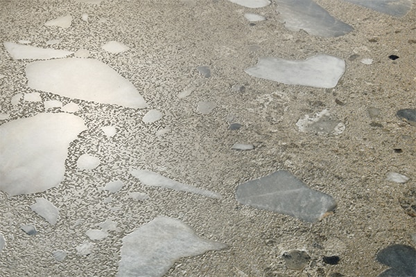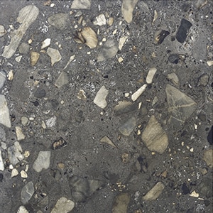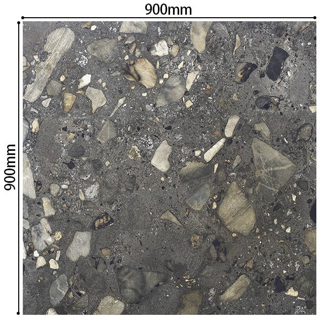 最新のプリント技術で骨材となる砕石を表現。さらに、その骨材部分だけを磨いて使い込んだような光沢を与え、主材の部分とは異なるテクスチャーに。長い年月にわたり、多くの人々が歩くことで磨耗していくという経年変化をイメージしています。