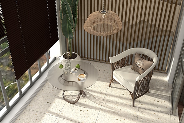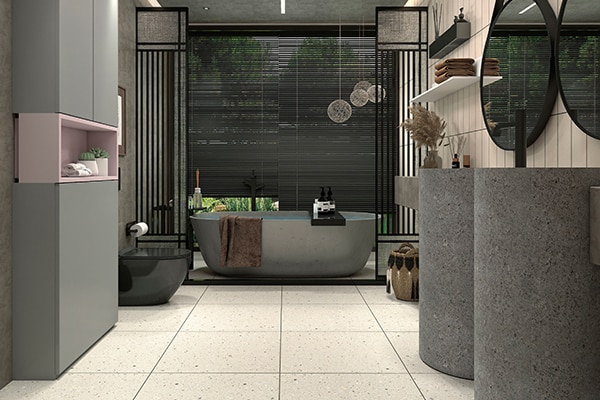 近年、リバイバルブームとなっているテラゾー風タイル。その中でも、控えめなデザインで幅広い空間に使いやすいのが《カラメッラ》です。混ぜ込んだ砕石を表すフレーク部分が小さめで、上品なイメージ。目を引きながらも主張しすぎることなく、リラックスした雰囲気を醸し出します。