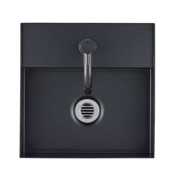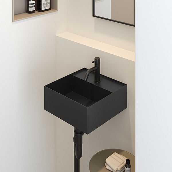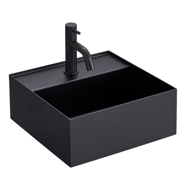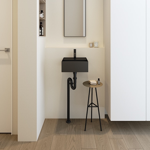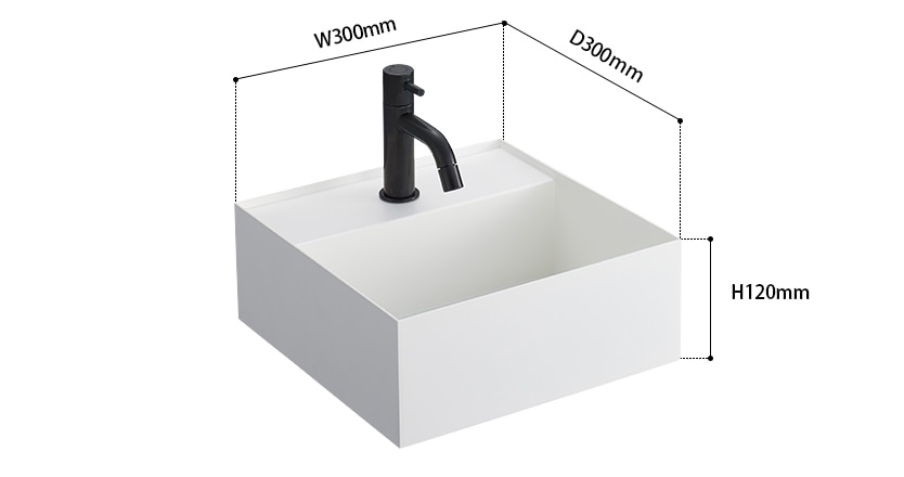そこで《ディプト》の登場です。幅も奥行も300mmの端正なスクエアフォルム。省スペースでも使い勝手の良さにこだわり、しっかり手を洗える深さも確保しました。カラーは、あらゆる空間に調和するホワイトとブラックの2色からお選びいただけます。
