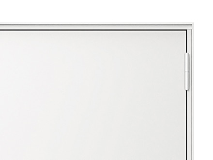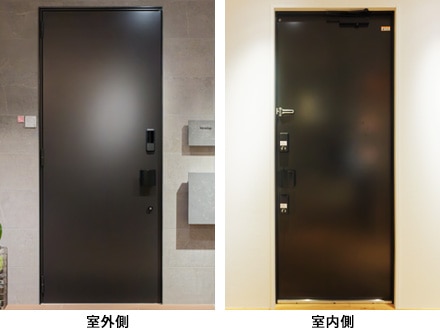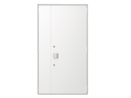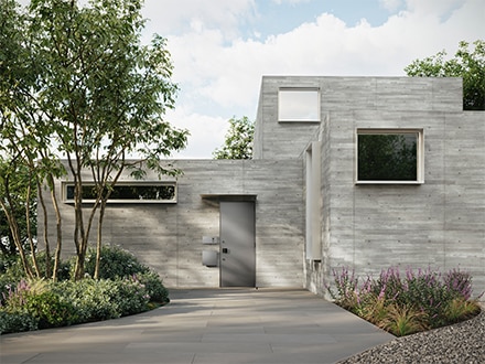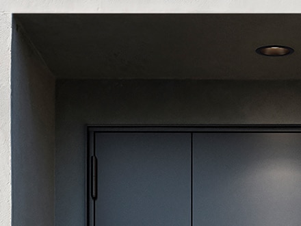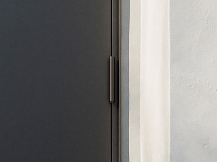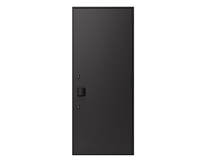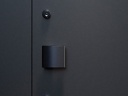 《ベリドール》は防火地域に対応した防火ドアでありながら、ミニマルな美しさを実現。シャープなエッジや、左右・上部の枠見付け幅の統一、さらに扉面と枠の段差を極力なくすことで、壁に埋め込んだようにフラットに見えるデザインです。さらに、丁番のカラーまで扉面材に合わせてノイズレスに。使いやすいプッシュプルハンドルと、錠のカラーは同色で揃えています。