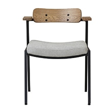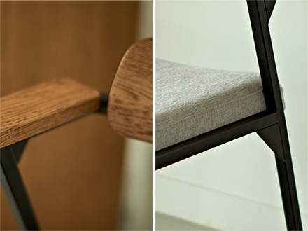 ダイニングにぴったりの<パティ>と<ドリス>。どちらもスチールフレーム&オーク材の組み合わせと、座り心地のよい厚めの座面が特徴です。細すぎないフレームは家具としての安心感をもたらし、ほどよく重厚感も漂います。座面の高さは<パティ>が420mmで、<ドリス>は450mmのやや高い設定です。