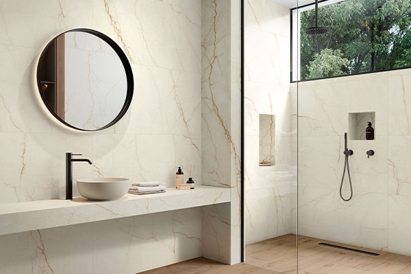 やわらかなベースカラーに、ゴールドや飴色の繊細なヴェイン(石目)を配した《ホワイトバランス》。大理石をモチーフとした数あるタイルの中でも、一段と優美な雰囲気を演出できます。屋内の床、壁に使用可能。白ベースなので空間が明るく広く見え、住宅、商業空間、ホテルなどに幅広く調和します。