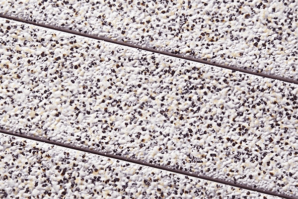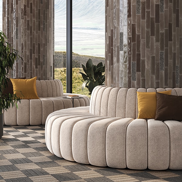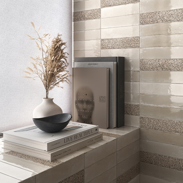 《インカント》は大きく分けて2種類の表情があります。光沢のあるタイプは、空間をやさしく包み込むような、香りや風味を連想させるカラー名が印象的。「グラニ」が付くカラー名は、ややマットな粒状のグラフィックで、奥行き感のある御影石に似た趣です。どちらも小ぶりで細長く、ヨコ使いだけでなくタテに貼ることもでき、モダンなイメージが高まります。