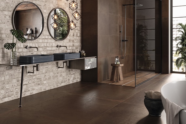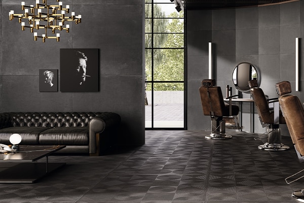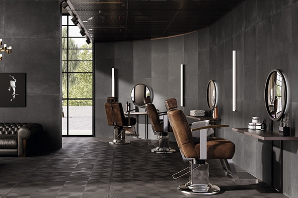 施工可能な範囲が広いことも《オキシド》の魅力。工業的な金属感をベースにした独特の表情を、屋内外でお楽しみいただけます。サイズは使いやすい600角に加え、大判の1200角もご用意。大型プロジェクトにも最適です。