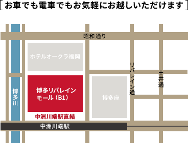 福岡ショールームは、地下鉄空港線「中洲川端」駅6番出口に直結した商業施設「博多リバレインモール」地下1階と、アクセスの良い立地にあります。
