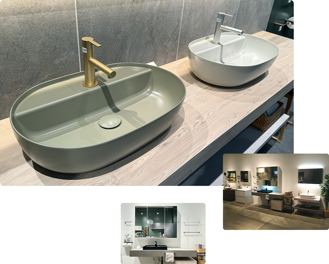 自由な組み合わせで理想の洗面空間にミラー・ボウル・水栓・カウンターetc...多種多様な機能・デザインの組み合わせを展示中!展示商品毎で壁の色や質感も変えています!洗面ボウルだけでなく空間全体のコーディネートの参考に!