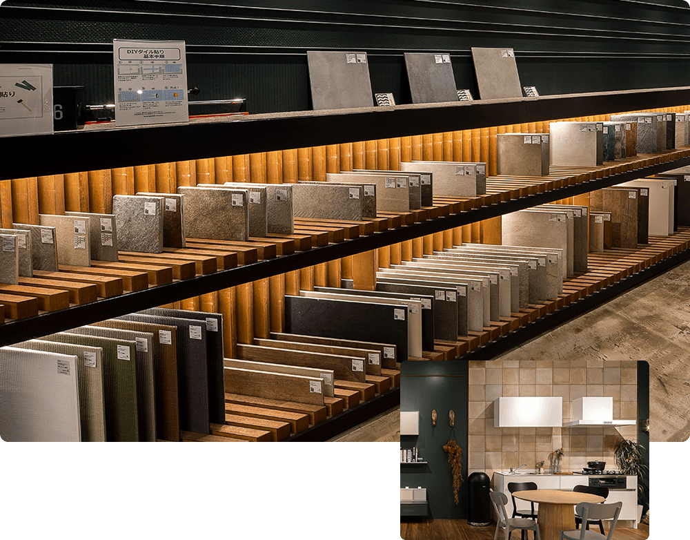 人気のシステムキッチン、洗面ボウルをはじめ、タイルやフローリングといった建築資材も豊富に展示中!